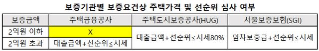 주금공 측은 보증금액 2억원 이하인 대출에 보증요건 심사를 하지 않는 이유에 대해 “주거 취약계층을 지원하기 위함”이라고 밝혔다. 다만 “대출 시 선순위채권 확인 관련 유의사항을 필수로 안내하고 있다”고 했다. 또 “2억원 이하 전세보증은 임차인의 개인상환 능력을 보증하는 ‘개인 신용보증’이며, 이외 조건은 은행 등 대출기관 기준에 따라 심사가 이뤄지고 있다”고 했다. 보증금액이 2억원 이하인 경우엔 은행이 전세대출을 내주기로 하면 별도의 심사를 거치지 않는다는 의미다.