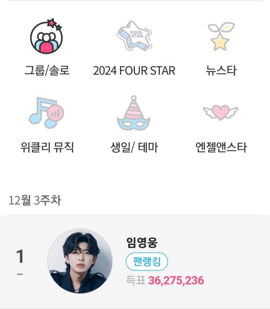 최근 '팬앤스타'에 따르면, 임영웅은 12월 3주 차 솔로가수 인기 랭킹 투표에서 1위에 등극했다.