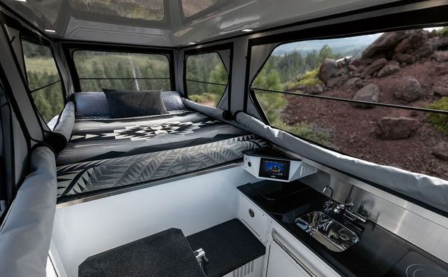 허머 EV가 장시간 전력 공급에서 자유로울 수 있는 비결은 페이로드에 완벽하게 맞는 캠핑카 부분이 허머 EV의 배터리를 전혀 소모하지 않는 데 있다. 대신 1500와트 인버터에 공급되는 독립형 6kWh, 12V 리튬 배터리를 통해 전력을 쓸 수 있다.