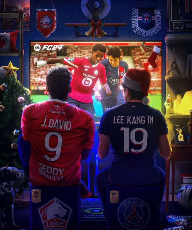 또 다른 리그1 계정에는 글로벌 축구게임 'FC24'를 홍보하기 위해 이강인이 크리스마스에 캐나다 공격수 조너선 데이비드(LOSC릴)과 게임을 하는 모습을 그림으로 제작해 게시했다.