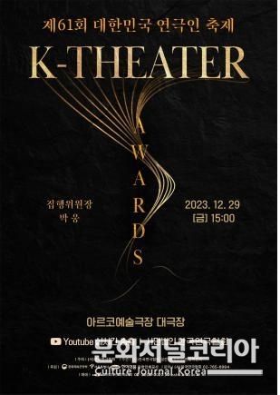 문화저널코리아 김영일 기자 | (사)한국연극협회가 주최하는 제61회 대한민국 연극인 축제 <K-Theater Awards>(집행위원장: 박웅)가 오는 2023년 12월 29일 오후 3시 대학로 아르코 예술극장 대극장에서 개최된다.