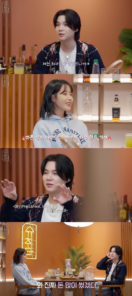 그러면서 슈가는 "제 주변 친구들도 많이 갔도 멤버들도 갔다. 저는 초대를 못 받았다"라며 서운함을 내비쳤다. 이에 아이유는 "또 한다 저 얘기. 마흔 살이 되어서도 저 얘기를 하고 있을 것"이라며 고개를 저었다.