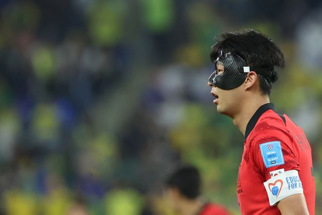 손흥민이 지난해 12월 6일(한국 시각) 카타르 도하 974 스타디움에서 열린 2022 카타르 월드컵 16강전 대한민국과 브라질의 경기에서 경기 도중 아쉬운 표정을 짓고 있다. / 연합뉴스