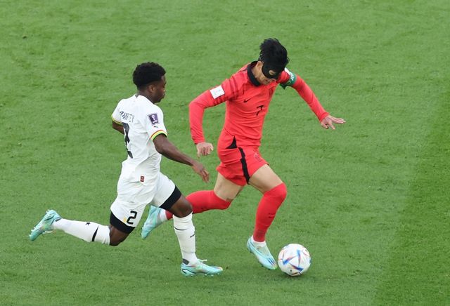 손흥민이 지난해 11월 28일 오후(현지 시각) 카타르 알라이얀의 에듀케이션 시티 스타디움에서 열린 2022 카타르 월드컵 조별리그 H조 2차전 대한민국과 가나의 경기에서 드리블 돌파를 시도하고 있다. / 연합뉴스