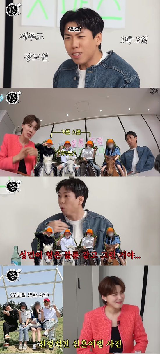양세찬은 "(유부남인)성민이 형은 괜히 불륜같더라. 나중에 사진 보니까 괜히 전형적인 신혼여행 같았다. 커플들끼리 찍은 사진 같더라"며 당시 찍은 사진을 공개했다.