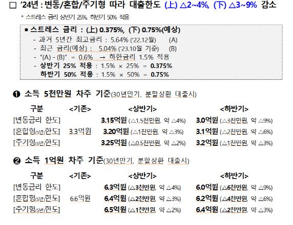 스트레스 금리 적용 기준은 고정금리 기간이다. 예컨대 30년 만기 대출의 경우 고정기간이 5~9년인 대출은 변동금리에 적용되는 스트레스 금리의 60%, 9~15년인 대출과 15~21년은 대출은 각각 40%·20%에 해당하는 스트레스 금리를 가산한다. 주기형은 혼합형 보다 금리 위험이 낮아 더 완화된 기준을 적용한다. 금리변동주기가 5~9년인 대출은 변동금리에 적용되는 스트레스 금리의 30%, 9~15년은 20%, 15~21년은 10%에 해당하는 스트레스 금리를 적용한다.