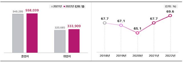 조사 결과 지난해 기준 취업률은 69.6%를 기록했다. 2018년 이후 최근 5년 내 가장 높은 취업률이다. 전년(2021년, 67.7%)보다는 1.9%포인트 증가했다. 진학자 등을 제외한 작년 취업 대상자는 47만9573명으로 이 가운데 33만3909명(69.6%)이 취업한 것으로 파악됐다.