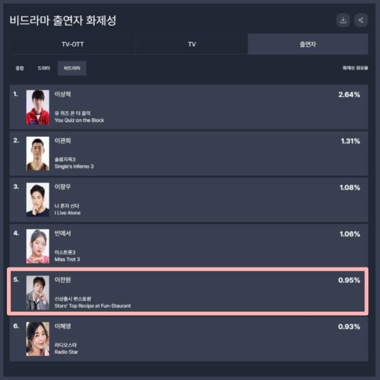 최근 굿데이터코퍼레이션의 발표에 따르면, 이찬원은 12월 2주 차 TV-OTT 통합 출연자 화제성 비드라마 부문 TOP5에 이름을 올렸다.