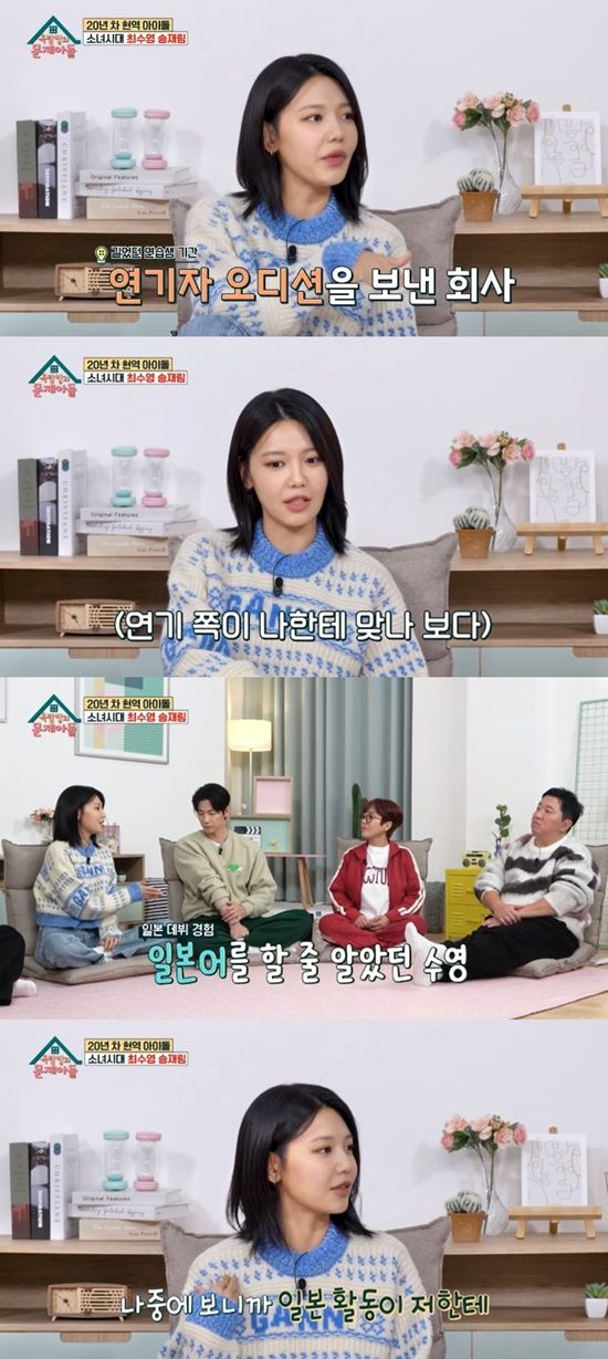 이날 최수영은 연기에 관심을 가지게 된 계기를 밝혔다. 그는 "제가 소녀시대 데뷔하기 전에 일본에서 가수로 먼저 활동했었다. 일본에서 활동하고 한국에 왔는데, 저는 연습 기간이 너무 오래돼서 회사에서 연기자 오디션을 보내고 있었다"라며 입을 열었다.