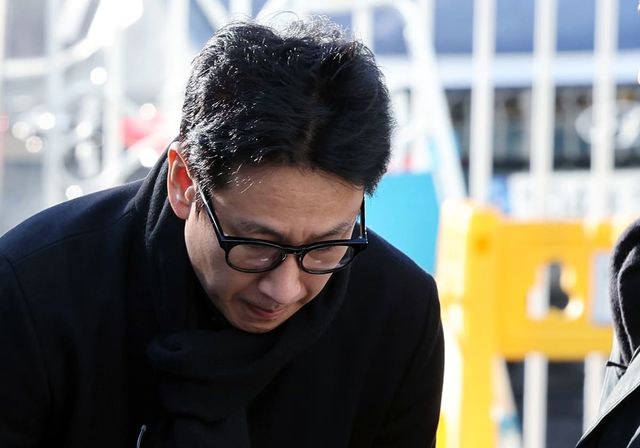 이선균이 지난 23일 3차 소환조사를 받기 위해 도착한 인천논현경찰서에서 고개를 숙이고 있다. / 뉴스1