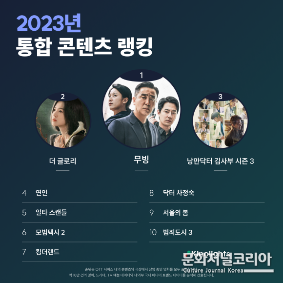 키노라이츠 연간 랭킹 1위작은 디즈니+ 오리지널 시리즈 [무빙]이 차지했다. [무빙]은 올해 8월부터 주간 통합 콘텐츠 랭킹에서 8주간 1위라는 유례 없는 기록을 세웠으며, 키노라이츠 어워즈에서 올해 최고의 한국 드라마로 꼽히기도 했다.