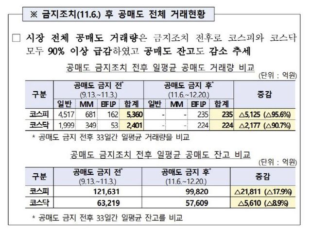 이밖에 금감원은 공매도와 관련 시장에서 떠도는 루머에 대해서도 점검했다. 특히 금감원은 공매도 금지 조치 이후에도 공매도 거래가 증가했다는 주장에 대해 공매도 거래량이 많은 에코프로비엠(247540)을 표본으로 선정해 확인한 결과, 공매도 거래량은 11월 3일 기준 737억원에서 지난 20일 기준 5억원으로 급감했다고 알렸다. 표본으로 선정한 에코프로비엠의 공매도 잔고가 같은 기간 505만주에서 508만주로 증가한 것에 대해서도 차입주식수의 증가 없이 보유 주식을 매도한 결과라고 전했다. 금감원 관계자는 “시장 전체 공매도 거래량은 공매도 금지 조치 전후로 코스피와 코스닥 모두 90% 이상 급감했고, 공매도 잔고도 감소 추세”라고 언급했다.