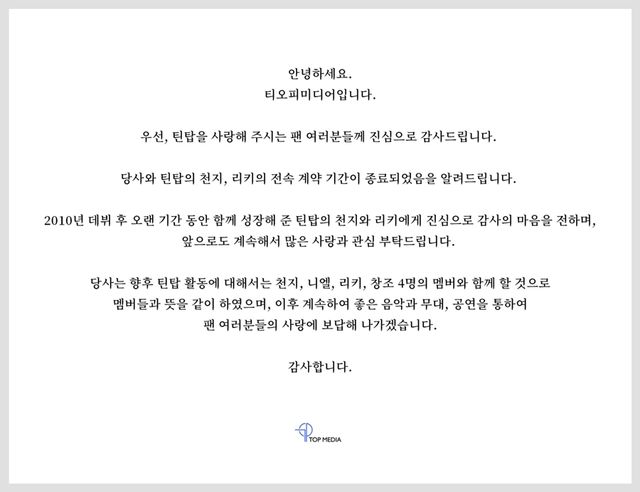 28일 소속사 티오피미디어는 "천지와 리키의 전속 계약 기간이 종료됐다. 향후 틴탑 그룹 활동에 대해서는 천지, 니엘, 리키, 창조 4명의 멤버와 함께할 것으로 뜻을 같이했다"고 전했다.