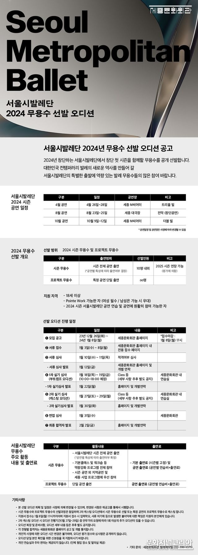 ‘서울시발레단 2024 시즌 무용수’의 지원 접수는 24년 1월 3일(수) 부터 당월 8일(월) 까지, 6일 간 진행되며, 오디션 관련 자세한 사항은 세종문화회관 홈페이지에서 확인할 수 있다.