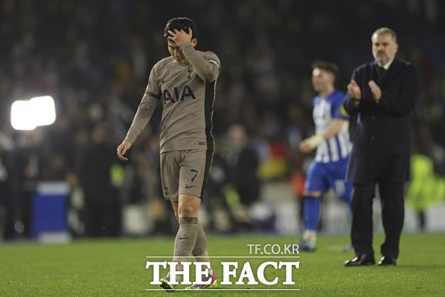 토트넘 '캡틴' 손흥민(왼쪽)이 29일 브라이튼과 EPL 19라운드 원정경기에서 시즌 5호도움을 기록했으나 팀의 2-4 패배를 막지 못해 힘들어하고 있는 가운데 안제 포스테코글루 감독이 박수로 위로하고 있다./팔머(영국)=AP.뉴시스