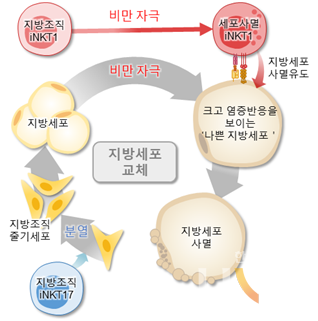 최근 서울대학교 자연과학대학 생명과학부 김재범 교수 연구진과 POSTECH 김종경 교수 연구진은 지방조직 내 면역세포의 일종인 ‘불변성 자연살해 T (invariant natural killer T, iNKT) 세포’가 지방세포 교체 과정에서 핵심적인 역할을 할 수 있음을 발견했다.