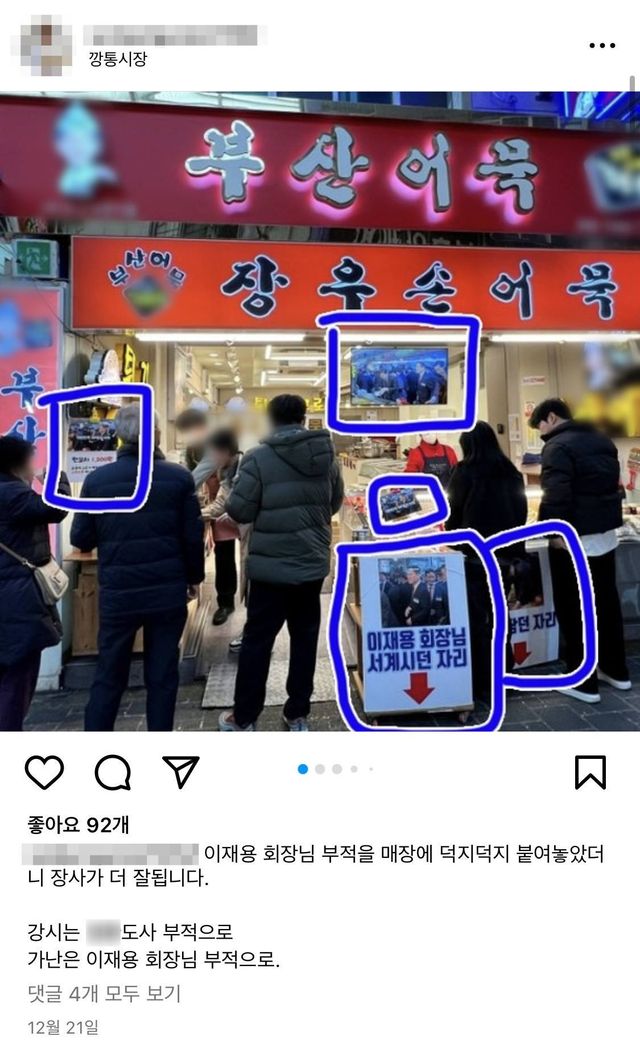 커뮤니티 게시물에는 지난 6일 이 회장 등이 방문한 부산 중구 부평깡통시장에 있는 한 어묵집의 최근 모습이 담겼다.