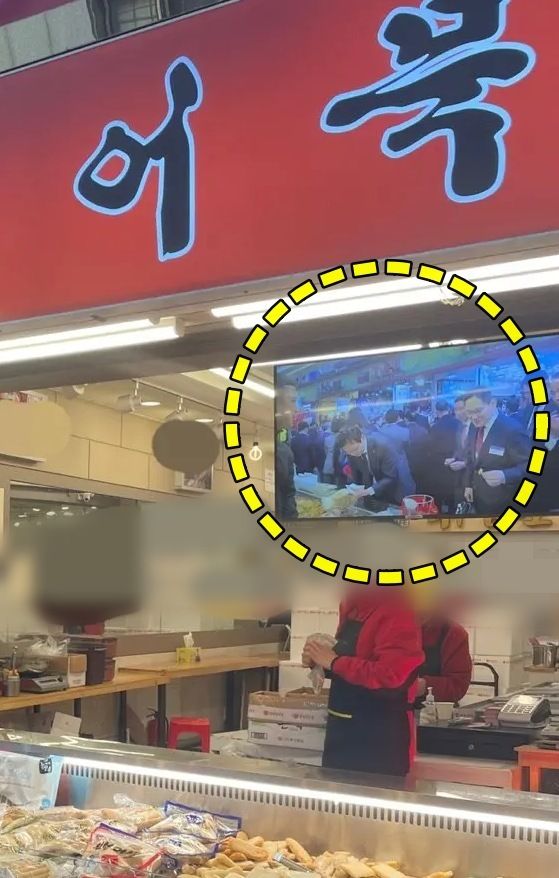 어묵집 매장 안 TV에선 이 회장 방문 당시 모습이 영상으로 무한재생되고 있다. / 더쿠