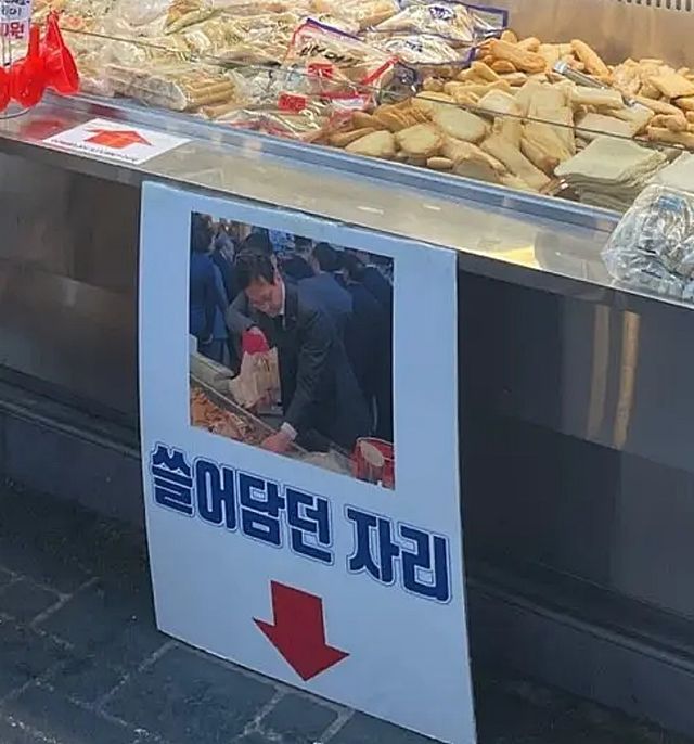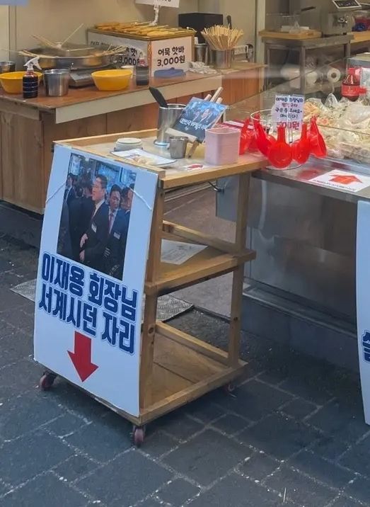 어묵집 사장님은 유명 인사들의 흔적을 매장 곳곳에 기록, '이재용 회장님 서 계시던 자리', '쓸어 담던 자리'를 표시해 두고 손님들이 같이 해당 공간을 즐길 수 있게끔 했다.