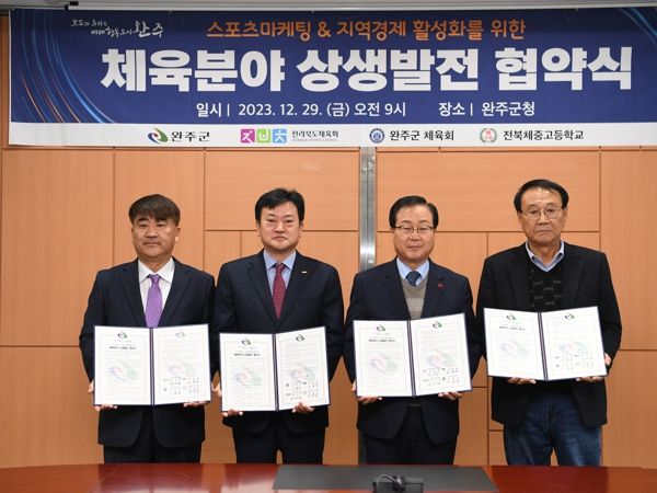 29일 완주군은 전라북도체육회, 완주군체육회, 전북체육고등학교와 스포츠마케팅을 통한 지역경제 활성화를 위한 상생발전 업무협약을 체결했다.