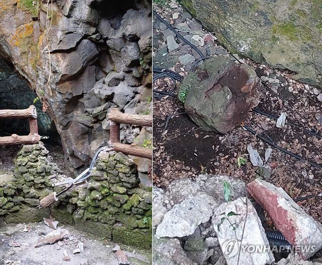 제주 만장굴 탐방로 입구에 떨어진 가로세로 약 1m 크기의 낙석(오른쪽)과 파손된 난간(왼쪽) 모습 / 독자 제공-연합뉴스