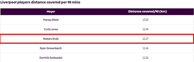 먼저 프리미어리그는 엔도의 운동량을 높게 평가했다. 그들은 "하비 엘리엇이나 커티스 존스의 젊은 다리에 비하지는 못하지만, 엔도는 여전히 90분당 평균 12.17km를 뛰면서 많은 영역을 커버하고 있다"라고 설명했다.