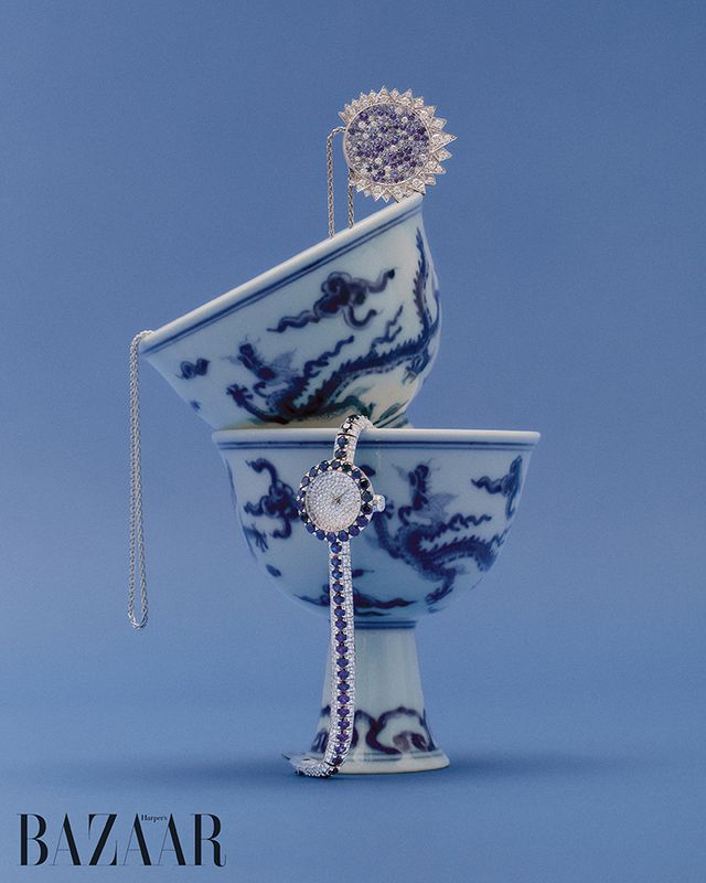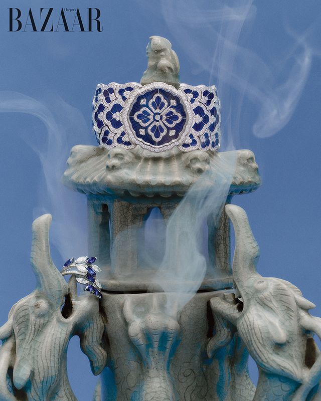 8백95개의 다이아몬드와 블루 에나멜이 조화로운 ‘튤레’ 시계는 Buccellati. 나뭇잎 모티프의 ‘빅토리아 바인 바이패스’ 반지는 Tiffany amp;Co..