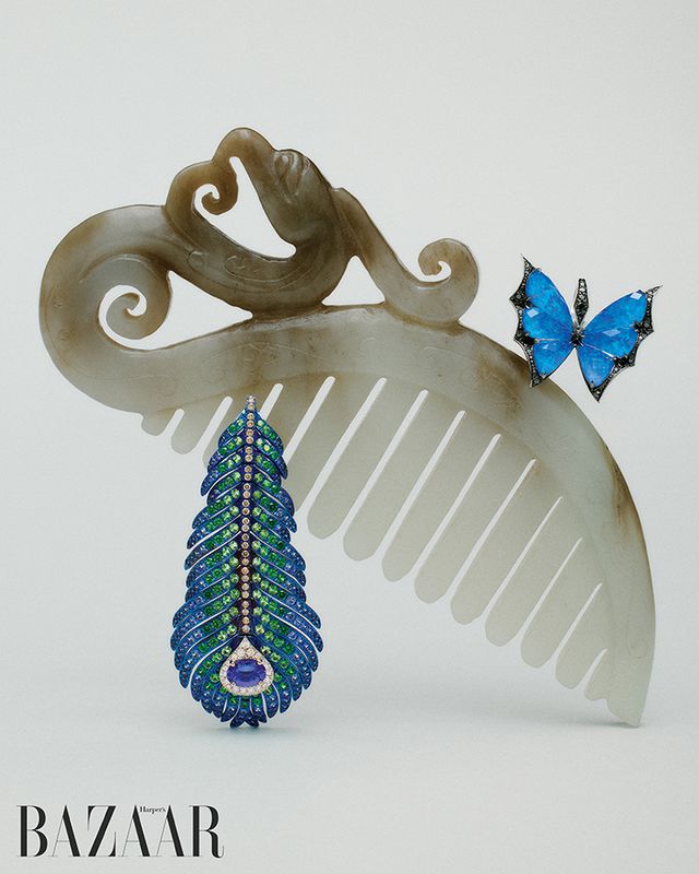 공작새 깃털 모티프의 ‘플륌 드 펑’ 귀고리는 7천만원대 Boucheron. 나비를 형상화한 '플라이 바이 나이트 펜던트'는 Stephen Webster.