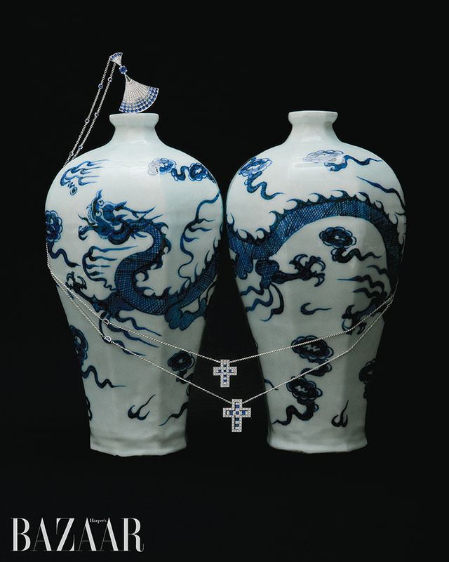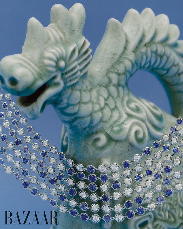 18K 화이트 골드에 다이아몬드와 사파이어를 오픈워크 구조로 세팅한 ‘씨 미스트 사파이어’ 목걸이는 Van Cleef amp; Arpels.