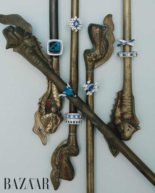 (위부터 시계 방향) 사파이어를 중심으로 다이아몬드를 장식해 꽃을 묘사한 ‘미모사’ 반지는 Damiani. X자 형태의 ‘주 드 리앙’ 반지는 2천만원대 Chaumet. X자 형태 사이로 사파이어와 다이아몬드가 교차된 ‘잔 슐럼버제 바이 티파니 식스틴 스톤’ 반지는 Tiffany amp;Co.. 사파이어와 11개의 다이아몬드를 조합한 ‘포에틱 가든‘ 반지는 Korloff. 다이아몬드와 사파이어가 조화로운 ‘벨 에포크’ 반지, 그 위에 레이어드한 ‘벨 에포크’ 반지는 Damiani. 블루 토파즈가 세팅된 ‘매그니피센트 파베 칵테일’ 반지는 9백만원대 Stephen Webster. 블루 토파즈를 따라 다이아몬드를 세팅한 ‘빵 드 쉬크르’ 반지는 Fred.