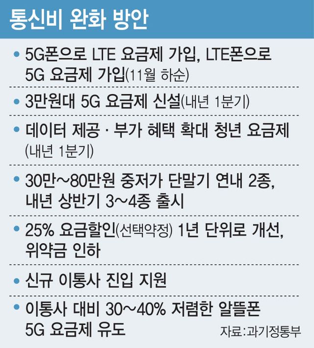 과기정통부는 통신사와의 협의를 통해 현재 4만원대 중반인 5G 요금제 최저구간을 3만원대로 낮췄다. 또 2~3종에 불과한 30기가바이트(GB) 이하 구간 요금제 또한 제공량에 따라 세분화한다.