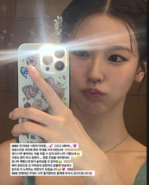 31일 미연은 자신의 인스타그램을 통해 "MBC 연기대상 시청자 여러분 그리고 네버버(아이들 팬덤) 영광스러운 자리에 축하무대를 서게 됐는데 제가 너무 좋아하는 곡을 부를수 있게 돼 너무 기뻤는데"라며 "긴장도 많이 하고 음정이 정말 큰일을 내버렸다"고 밝혔다.