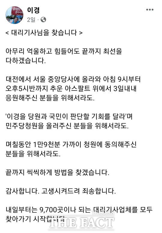 이 전 부대변인은 이날 페이스북에 "대리기사님을 찾는다"면서 "아무리 억울하고 힘들어도 끝까지 최선을 다하겠다"며 "내일부터 9700곳이나 되는 대리기사 업체를 모두 찾아가기 시작한다"고 적었다. 이 전 부대변인은 국회 앞 대로변에 이러한 내용의 현수막을 걸기도 했다.