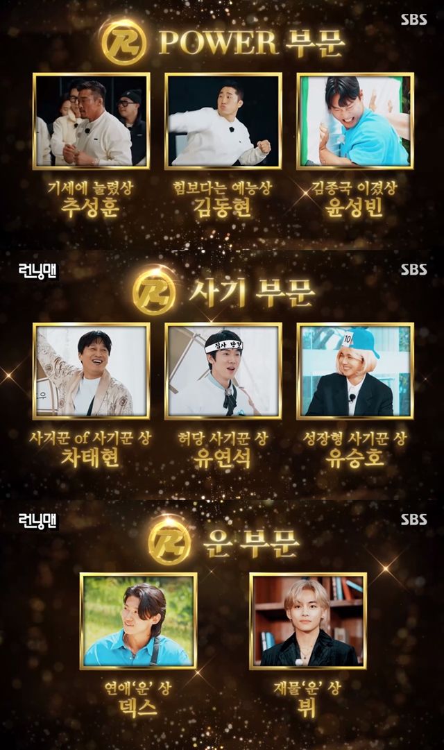 이날 '런닝맨'은 여러 부문을 통해 남다른 활약을 펼친 게스트들을 재조명했다. 먼저 POWER(힘) 부문에는 '기세에 눌렸상' 추성훈, '힘보다는 예능상' 김동현, '김종국 이겼상' 윤성빈이 받았다.