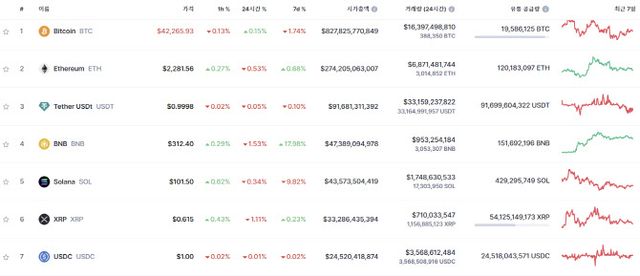 1일 가상자산 시황중계 사이트 코인마켓캡에 따르면 이날 오전 9시 기준 비트코인 가격은 4만2265.93달러로 24시간 이전대비 0.15% 올랐다. 다만 최근 7일과 비교하면 1.74% 하락한 금액이다.
