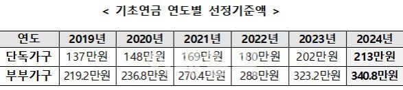 보건복지부는 2024년도 기초연금 선정기준액을 단독가구 213만원, 부부가구 340만8000원으로 결정한다고 1일 밝혔다. 노인 가구별 월 소득인정액이 해당 선정기준액 이하이면 기초연금을 받을 수 있다.