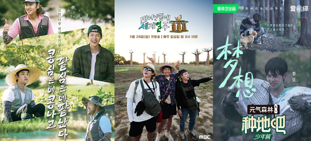 依次为《瓜瓜豆豆》《既然出生就环游世界》《种地吧少年》综艺海报【图片提供 网络】
