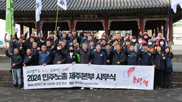 [한라일보] 민주노총 제주본부(이하 민주노총)는 2일 오전 10시 제주시 관덕정에서 2024년 시무식을 열고 윤석열 정권 퇴진과 한국사회대전환 투쟁을 선포했다.