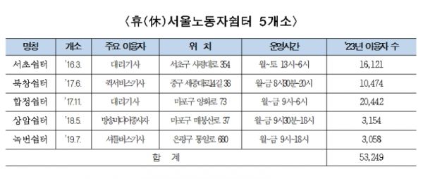 서울시는 찾아가는 이동노동자 쉼터 외에도 이동노동자의 안전하게 쉴 권리 보장을 위해 ▲서초 ▲북창 ▲합정 ▲상암 ▲녹번 등 5곳에 거점형(고정) 쉼터인 ‘휴(休)서울노동자쉼터’도 운영하고 있다.