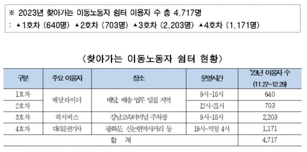 또한 2023년은 주요 이용자를 기존 배달라이더, 퀵서비스 기사에서 대리운전기사까지 확대하고 업종별 주 활동 시간대와 지역을 반영해 맞춤형으로 쉼터를 운영했다. 전년대비 약 2배 증가한 수치가 이동노동자 쉼터를 이용했다.