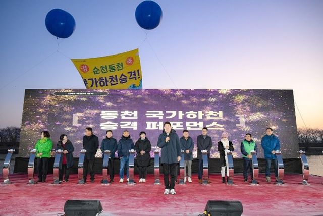 이날 해맞이 행사는 기(氣)무예단의 우렁찬 모듬북 공연에 맞춰 동천 국가하천 승격을 축하하는 퍼포먼스와 함께 청룡 여의주에 소망 쓰기, 새해 덕담 나누기, 시민들의 새해 소망을 직접 들어보는 현장 인터뷰 등으로 진행됐다.