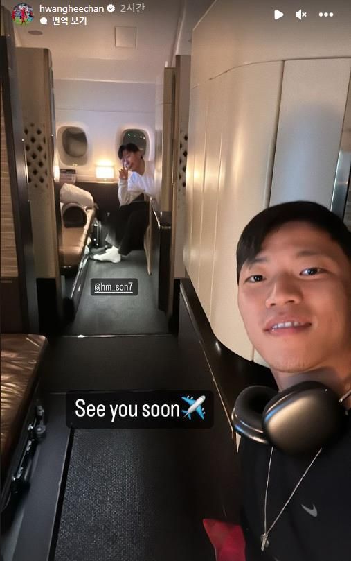 황희찬은 3일(이하 한국시각) 자신의 SNS에 손흥민과 함께 한국 축구대표팀 합류를 위해 비행기에 탑승해 있는 사진을 게재했다.