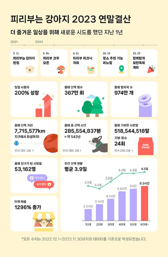 이에 2022년 대비 일일 이용자 200%, 산책 시간 230%, 산책거리·횟수·발자국 획득 수 모두 2배 이상 상승했다. 유기동물을 돕기 위한 발자국(산책 시 거리에 따라 자동 산정)과 사료알도 2022년 대비 2배 이상 늘어 각각 974만개와 약 52억알을 기록했다. 또한 1년간 24회에 걸쳐 영양제, 약품, 장난감, 고양이 모래, 방한용품 등 보호소(동물구조 119, 다시 사랑받개, 동물보호단체 행강, 행복한 유기견 세상)에서 필요로 하는 물품으로 환산돼 기부 완료했다.
