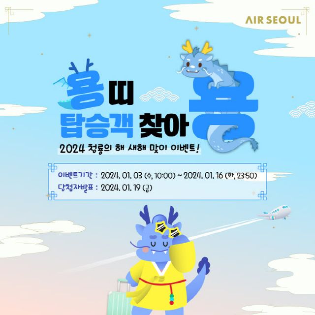 에어서울 관계자는 “2024년 첫 이벤트로 건강과 행복, 부를 상징하는 것으로 알려진 용과 관련한 이벤트를 준비했다”며 “고객들의 행복한 여행을 위해 2024년에도 매월 다양한 프로모션을 선보일 것”이라고 말했다.
