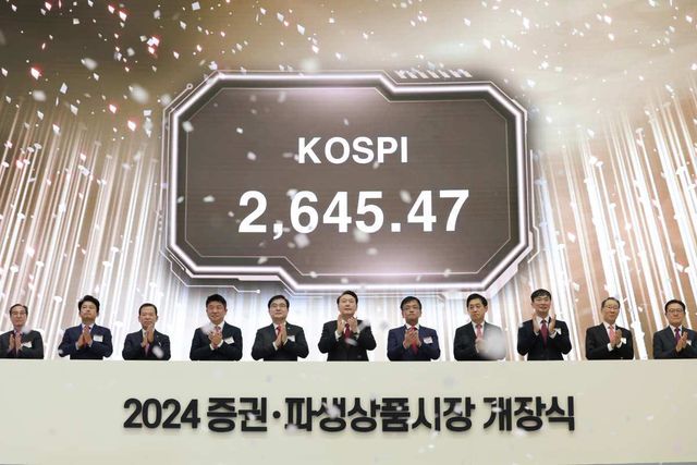 윤석열 대통령이 지난 2일 서울 영등포구 한국거래소에서 열린 2024 증권ㆍ파생상품시장 개장식에서 개장 신호 버튼을 누른 뒤 박수치고 있다. / 대통령실 제공-뉴스1