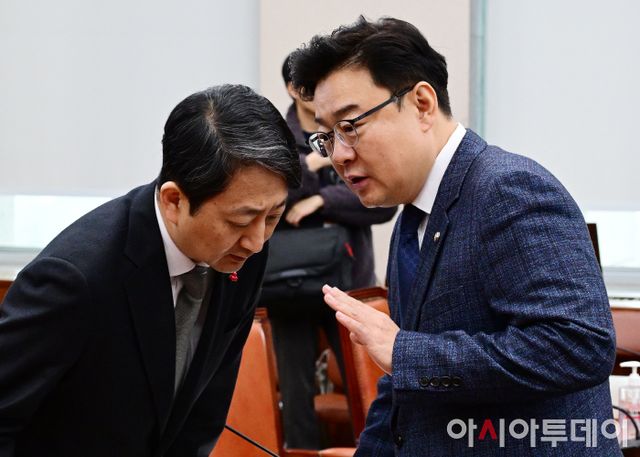 아시아투데이 이병화 기자 = 안덕근 산업통상자원부 장관 후보자가 3일 국회 산업통상자원중소벤처기업위원회에서 열린 인사청문회를 앞두고 김성원 국민의힘 간사와 대화를 나누고 있다. 이날 오전 예정됐던 청문회는 더불어민주당 비상의원총회 등으로 인해 오후로 연기됐다.
