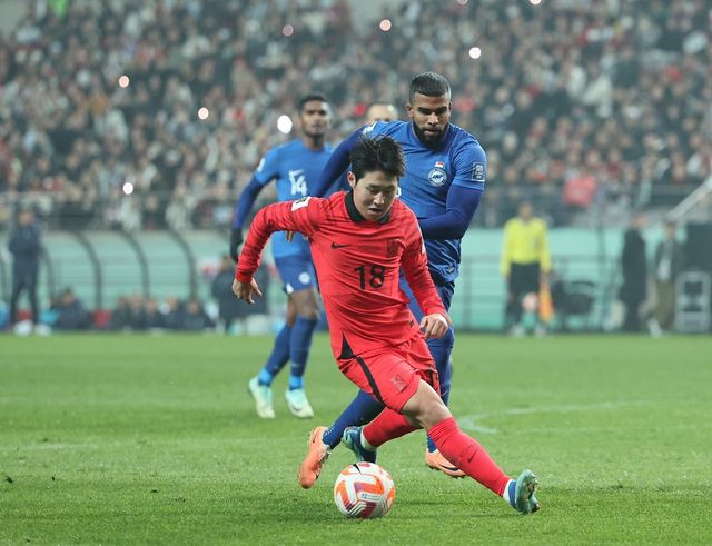 이강인이 지난해 11월 16일 서울 마포구 서울월드컵경기장에서 열린 2026 북중미 월드컵 아시아지역 2차 예선 C조 1차전 한국과 싱가포르의 경기에서 돌파를 시도하고 있다. / 연합뉴스