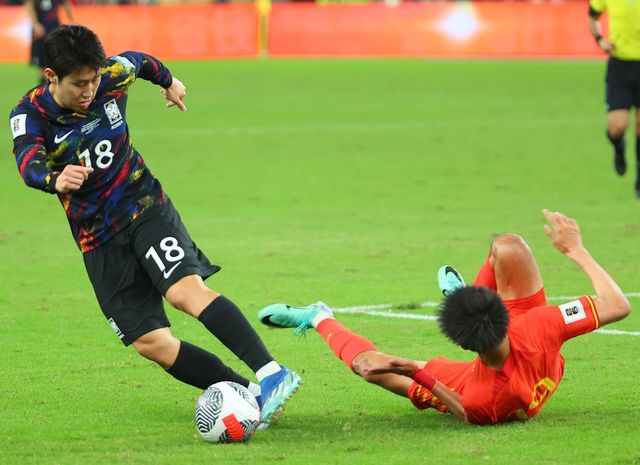 이강인이 지난해 11월 21일 중국 선전 유니버시아드 스포츠센터에서 열린 2026 북중미 월드컵 아시아 2차 예선 한국과 중국의 경기에서 중국 류양와 볼 경합을 끝에 공을 따내고 있다. / 연합뉴스