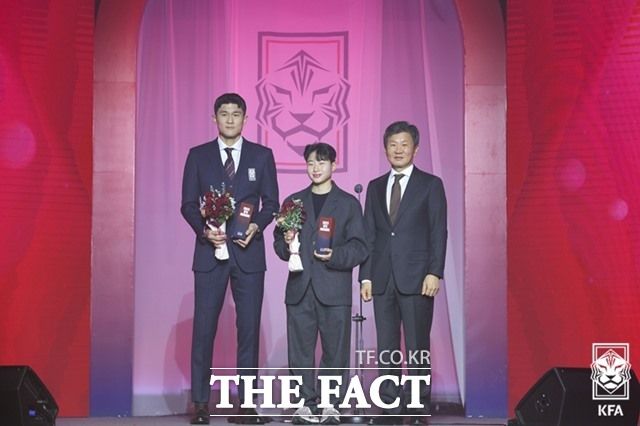 2일 열린 2023 KFA 시상식에서 올해의 선수상을 수상한 김민재(왼쪽)와 천가람, 시상자인 정몽규 대한축구협회장./KFA
