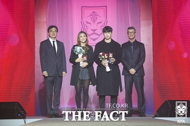 황재원과 케이시 유진 페어가 영플레이어상을 수상했다. 왼쪽부터 황선홍 U-23 국가대표팀 감독, 케이시 유진 페어, 황재원, 콜린 벨 여자 국가대표팀 감독./KFA